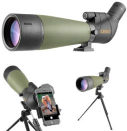 includes: •Tripod, •Carrying Bag •Smartphone Adapter The latest Waterproof Scope for Target Shooting, Hunting, Bird Watching, Wildlife & SceneryThe Gosky 20-60x80 has a variable 20x to 60x magnification and dynamic lens focusing system, making it easy to zoom in on your target. Its perfect for bird watching, target shooting, archery, hunting, the game reserve, observing wildlife, hiking, camping, outdoor activities and astronomical observation.A fully multi-coated 80mm green film objective lens provides a field of view at 25.2m-14.6m @ 914 meters. The quality BAK4 Porro prism optics increases light transmission and make your view brighter, clearer and delivers crisp images.A nitrogen filled waterproof and fog-proof design enables the scope to withstand the toughest environments. Its durable Framework and Rubber Armor provide a non-slip shock-proof grip and durable external lasting protection. The eyepiece shield is adjustable to cater for glasses.A smartphone digiscoping adapter is included enabling you to take photos and videos of your target, bringing you closer to nature and enabling you to easily explore and share the world around you through smartphone. The box includes a metal tabletop tripod for stable observation, eyepiece and lens protective covers, a cleaning cloth and a convenient carry case.