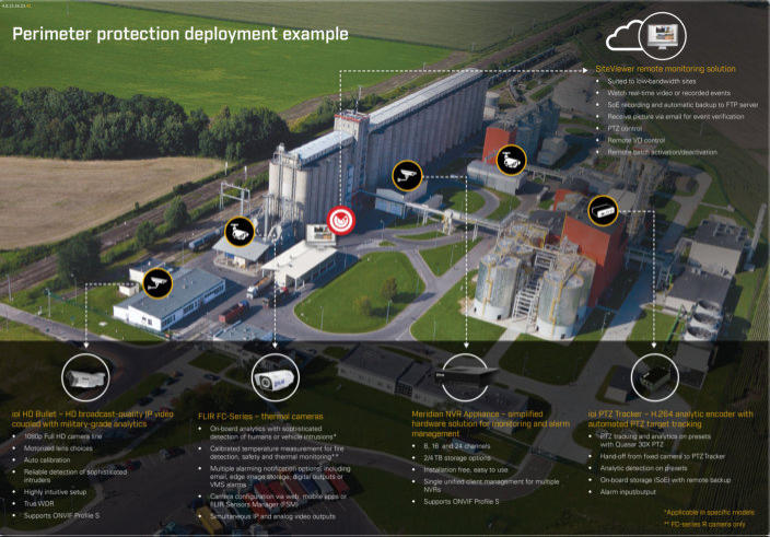 PROTECTING YOUR PERIMETERAt FLIR, we understand your challenges in securing your critical infrastructure and protecting your perimeter. We also understand that, like every customer, your requirements are unique. With that in mind, we have developed a complete set of perimeter protection solutions, built on top of ioimage military grade analytics, that address your specific needs.No matter what your requirements are whether tracking distant targets approaching your facility or detecting intruders breaching your perimeter, sending alarms to a control center or to remote client...sending a live video stream from a security patrol…activating a siren…or closing a gate. FLIR has all the solutions you need for handling your security events.PERIMETER PROTECTION BY FLIRALL YOU NEED TO SECURE YOUR SITE.